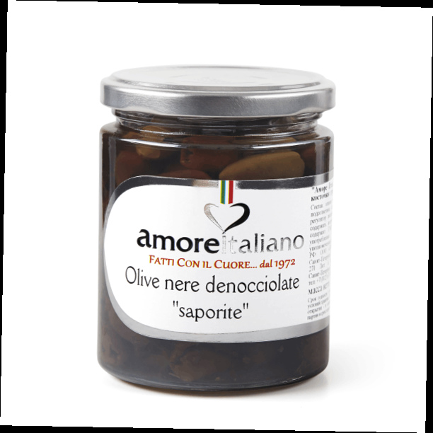 Черные оливки, собранные вручную и замаринованы без косточек в качественном растительном масле с добавлением зелени и специй.