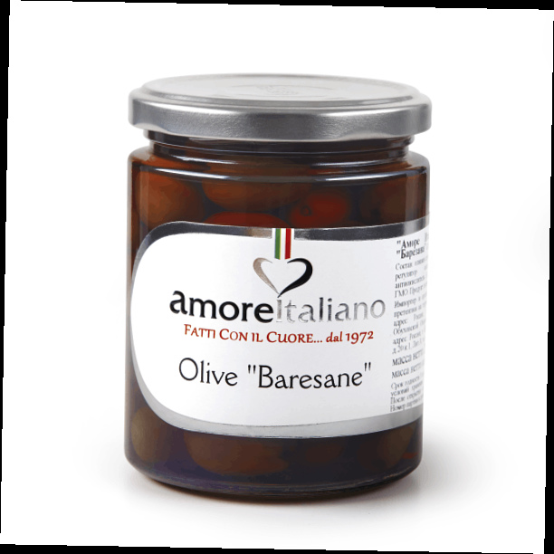 Состав: Оливки сорта «Барезана» с косточкой, вода, соль, регулятор кислотности: молочная кислота, антиокислитель: L-аскорбиновая кислота.