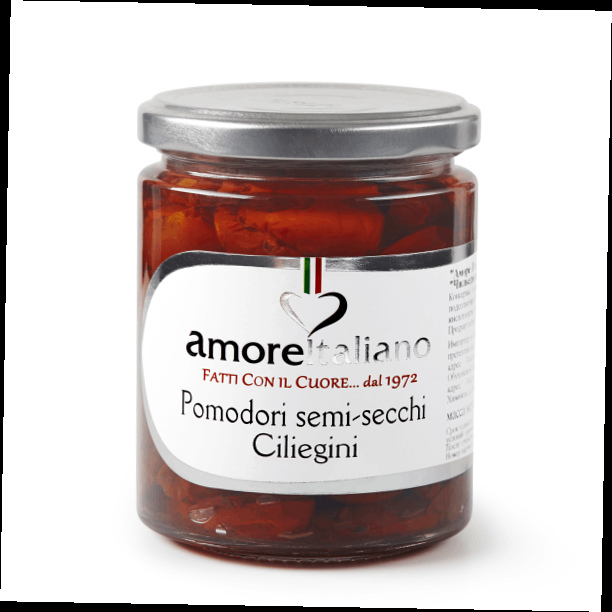 Полусушеные половинки помидоров Ciliegino, сохранившие сочность, аромат и свежесть в маринаде из качественного подсолнечного масла, душистых специй и свежих трав.